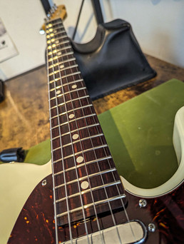 This American Professional II #Telecaster had slight fret sprouting, I've bevelled the edges, also taking back the lacquer as my client wanted a classic 'played in' Rosewood fretboard feel, the nitro humped over the sprouted edges and made for an odd feel. Really happy with the smoothness now and finished off with a very low, buzz free action 🔥
