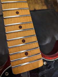 Stainless Steel Refret on this 2009 Gordon Smith GS1. The fretboard edges had huge chips where the frets were placed, I've sanded this back when the new fretwork was pressed in and then colour matched with stains.