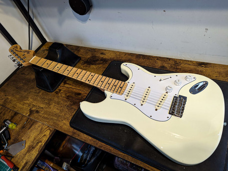 I've not had a huge amount of experience playing a scalloped fretboard, but I'm pretty sure they're not meant to play like this - either way, after removal of those cheap Chinese pots and dodgy wiring, replaced with vintage noiseless pickups and CTS Pots, this now feels great to play, setup with 9-42".